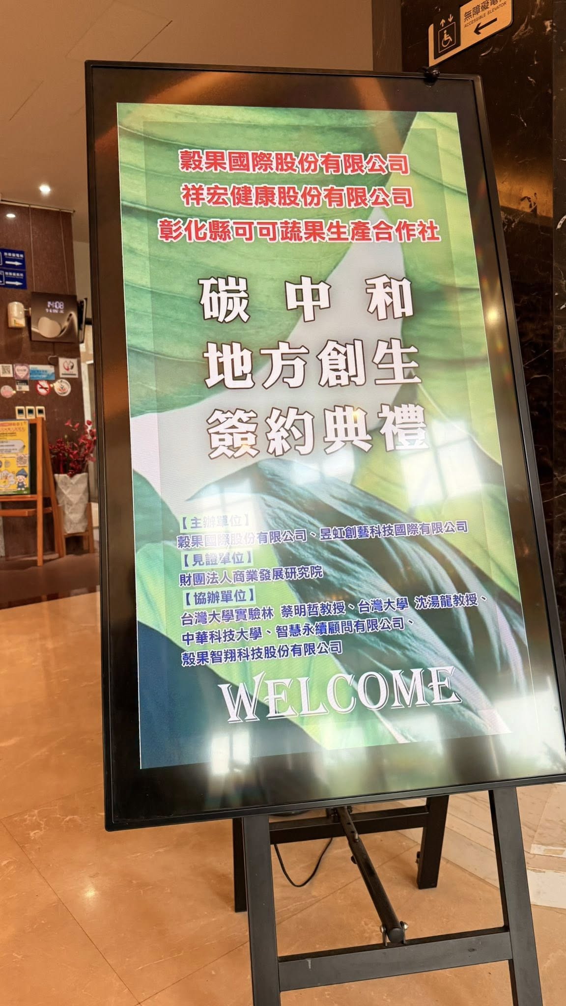 穀果國際股份有限公司(9/16)於雲林盛大舉行「碳中和地方創生簽約典禮」,與祥宏健康股份有限公司、昱虹創藝科技國際有限公司、保證責任彰化縣可可蔬果生產合作社分別簽署合作協議。